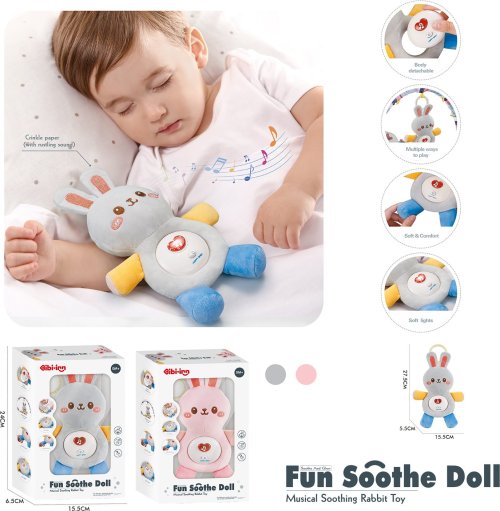 3 uspávanky, 4 zvukové efekty, jemné svetielko, vyrobené z vysoko kvalitného plyšu - veľmi mäkký a jemný, šuštivé uši, možnosť nasadenia na kočík, na prevádzku sú potrebné batérie 2x AG13 1,5V (nie sú súčasťou balenia).