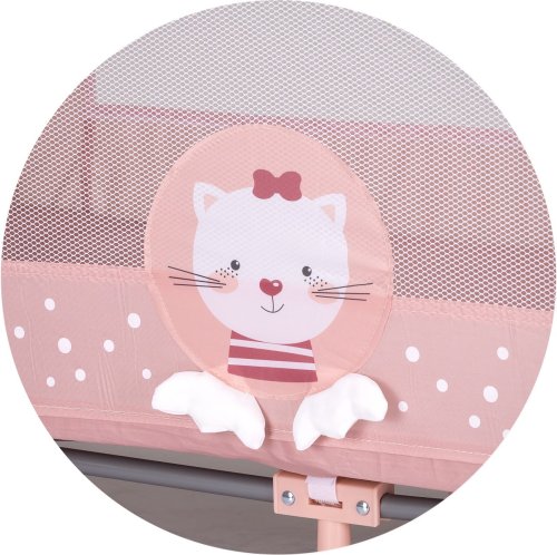 roztomilé prevedenie s motívom mačičky, vhodná pre novorodencov a deti do 15 kg, rýchle a ľahké skladanie, bočný vstup so zipsom, mäkká podložka pre spodnú úroveň, hrany postieľky sú pokryté plastovými krytmi pre maximálnu bezpečnosť dieťaťa, prepravná taška - chráni pred nečistotami, uľahčuje prepravu a skladovanie.