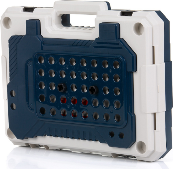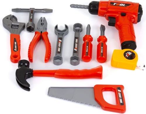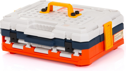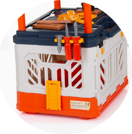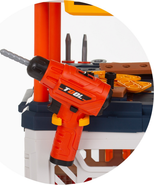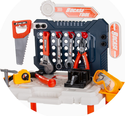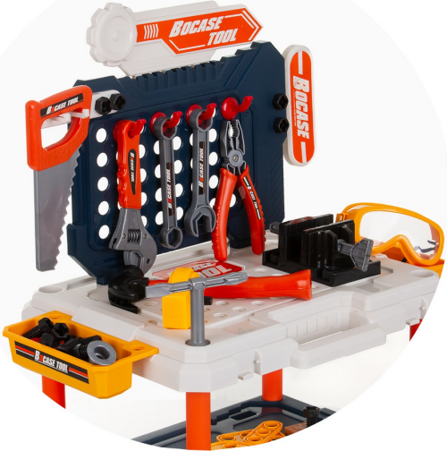 obsahuje 90ks príslušenstvo - kufrík, ponk, vŕtačku, náradie a ďalšie doplnky, kufrík sa premení na pracovný stôl, interaktívna hračka so zvukmi, na prevádzku sú potrebné batérie: 2ks AA (nie sú súčasťou balenia), rozmery výrobku (v zloženom stave): 80 x 54 x 33 cm.