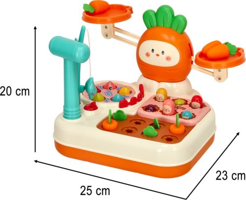 obsahuje štyri rôzne aktivity, stimuluje logické myslenie, pozornosť a trpezlivosť. rozvíja jemnú motoriku a zlepšuje logické myslenie, pestré farby a rozmanité textúry priťahujú pozornosť dieťaťa, deti môžu pri hre experimentovať so závažiami a učiť sa základným fyzikálnym princípom, priložený rybársky prút umožňuje deťom precvičovať koordináciu a motoriku. a stavať rôzne konštrukcie.