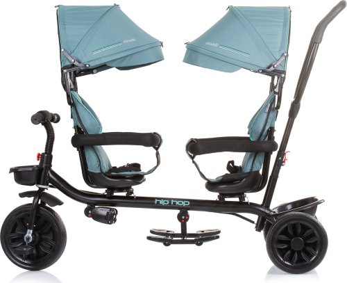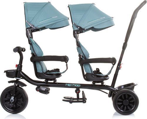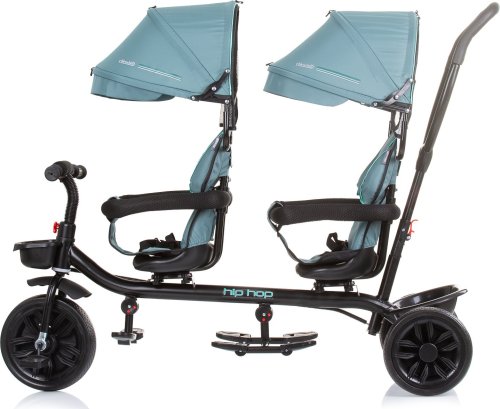 multifunkčný výrobok s 2 rôznymi spôsobmi použitia - rodič deti tlačia alebo dieťa vpredu trojkolku poháňa pomocou pedálov dve polohy predného sedadla - režim v smere jazdy a režim, kedy deti sedia čelom k sebe obe sedadlá sa otáča o 360 stupňov obe sedadlá sú vybavené bezpečnostnými madlami pohodlná rukoväť pre rodičov dve skladacie a pohyblivé opierky nôh blatníky na prednom kolese dve veľké skladacie striešky so slnečnými clonami dve široké a pohodlné sedadlá s mäkkým textilným poťahom a bezpečnostnými pásmi úložné koše vpredu a vzadu brzdové pedále na zadných kolesách kryt kolesa na prednom kolese zachytenie detských nôh