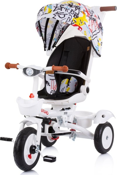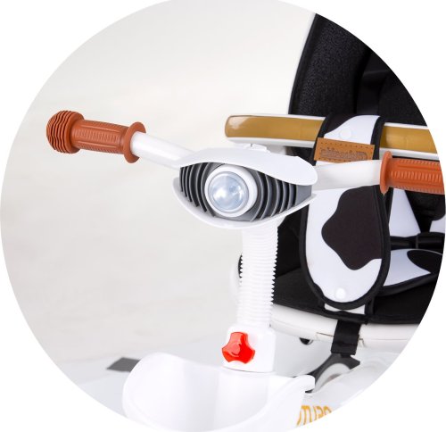 Multifunkčný výrobok s 2 rôznymi spôsobmi použitia - rodič tlačí dieťa alebo dieťa samo riadi hračku pomocou pedálov, strieška, rodičovská rukoväť a ochranné madlo sú odnímateľné, riadidlá s hudbou a svetlom - na prevádzku sú nutné 2ks batérií typ АА,1,5V, vysoko kvalitné gumové kolesá - predné 10", zadné 8"; sedačka je vybavená ochranným madlom a bezpečnostnými pásmi s mäkkými ramennými vypchávkami, 2 polohy naklonenia sedadla, 2 polohy otočenia sedadla - sedadlo v smere alebo v protismere jazdy, rukoväť z eko-kože výškovo nastaviteľná do 3 polôh, pohodlná výškovo nastaviteľná ka, skladacia strieška so slnečnou clonou, široké a pohodlné sedadlo s mäkkým polstrovaným textilným poťahom, úložný kôš vpredu a vzadu, kryt kolesa na prednom kolese, ktorý zabraňuje zachyteniu nôh dieťaťa, predné koleso je možné zablokovať, blatníky na všetkých kolesách, jednoduché skladovanie - ľahké sklopenie operadla aj zadné.