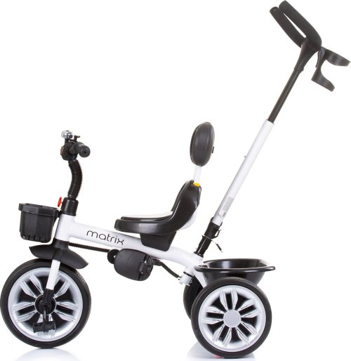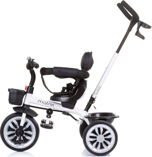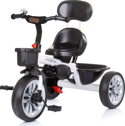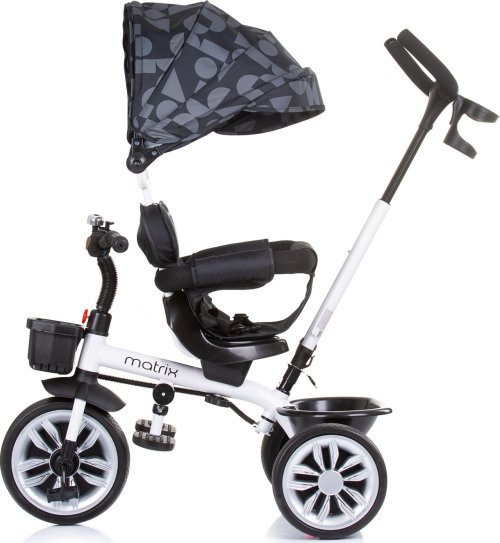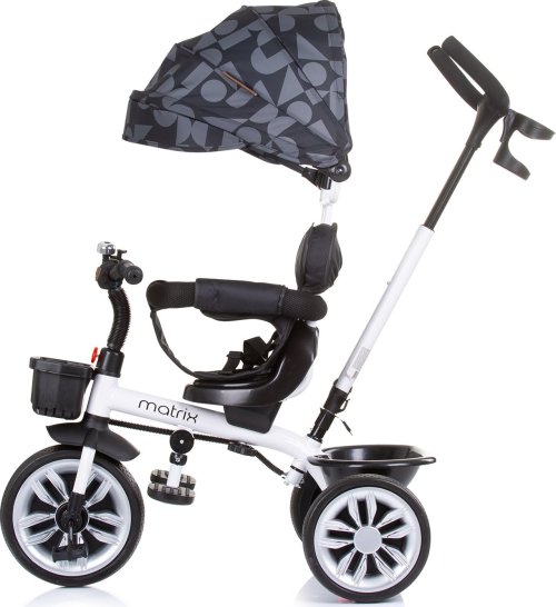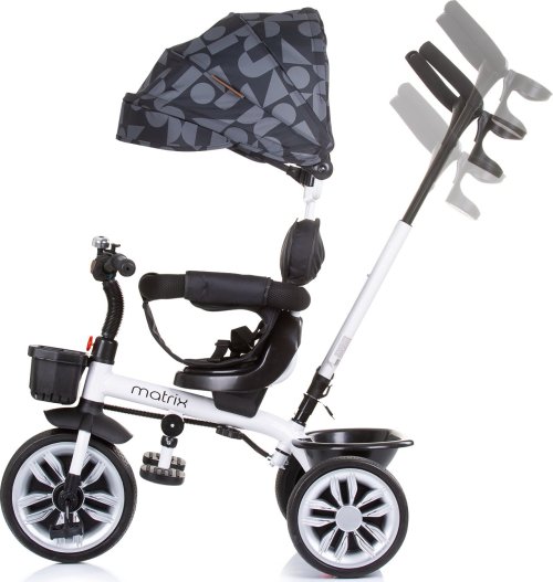 Multifunkčný výrobok Chipolino Trojkolka so strieškou Matrix Ebony s 2 rôznymi spôsobmi použitia - rodič tlačí dieťa alebo dieťa samo riadi hračku pomocou pedálov. Trojkolka sa stane skvelým spoločníkom, ktorý porastie spolu s dieťaťom.