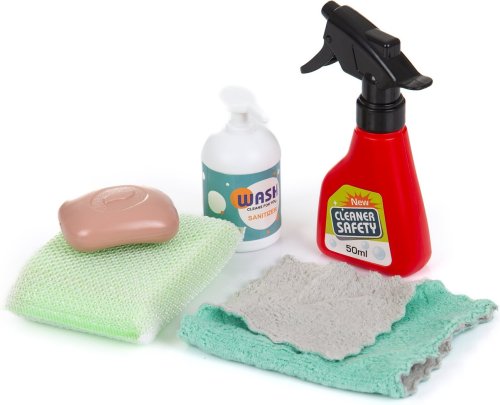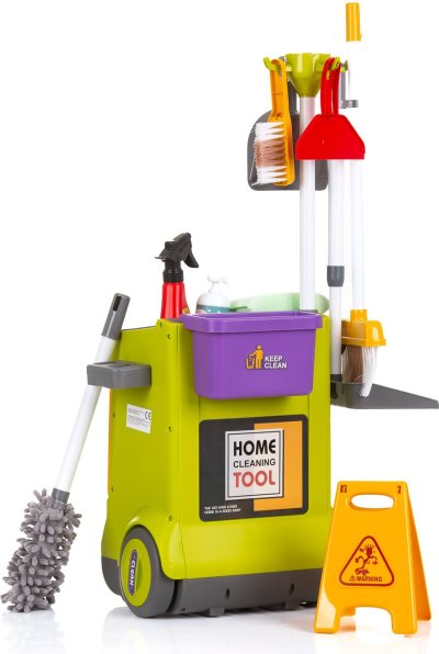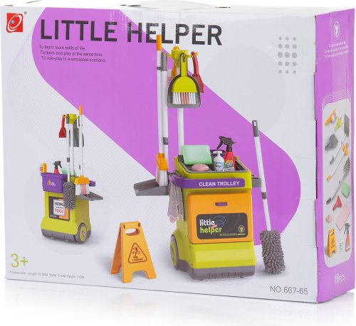 obsahuje 16ks príslušenstvo - vozík, metlička, metlička s lúpatkou, čistiace prostriedky, handričky, ceduľu a ďalšie doplnky, rozmery vozíka: 71 x 31 x 33,5 cm.