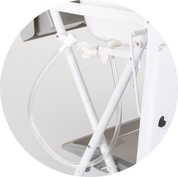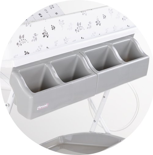 výrobok je možné použiť ako prebaľovací pult a po sňatí prebaľovacej podložky ho môžete použiť ako vaničku, skladací stojan na vaničku pre pohodlie rodičov, priehradka na príslušenstvo, ktorú je možné použiť na uskladnenie potrebných vecí, prebaľovaciu podložku je možné odklopiť na stranu, hadice a zátka pre ľahké vypustenie vody, rozmery: 80 × 8.