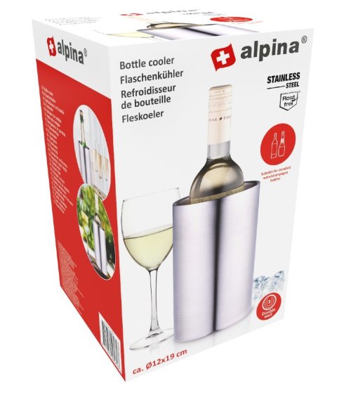 Elegantný a nadčasový – chladič fliaš Alpina je ideálny chladič na víno, sekt a šampanské na každú príležitosť. Dvojplášťový chladič z nerezovej ocele udrží váš nápoj studený po dlhú dobu a šikovne vylepší vašu výzdobu stola. Rozmery (OxV): 120x190 mm. Materiál: nerezová oceľ.