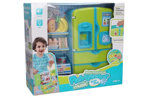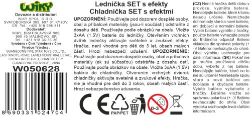 Chladnička s regálom s potravinami. Veľkosť 28cm. Obsahuje chladničku s dávkovačom ľadu, nálepky na chladničku, regál s potravinami. batéria 3xAA nie je súčasťou
