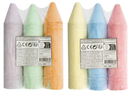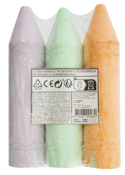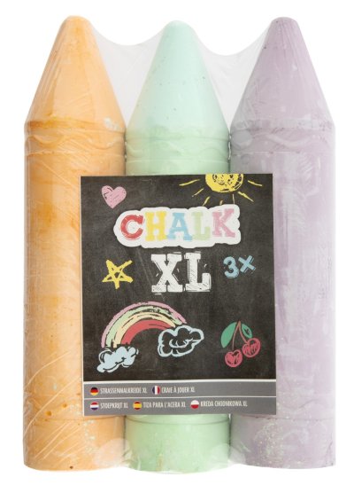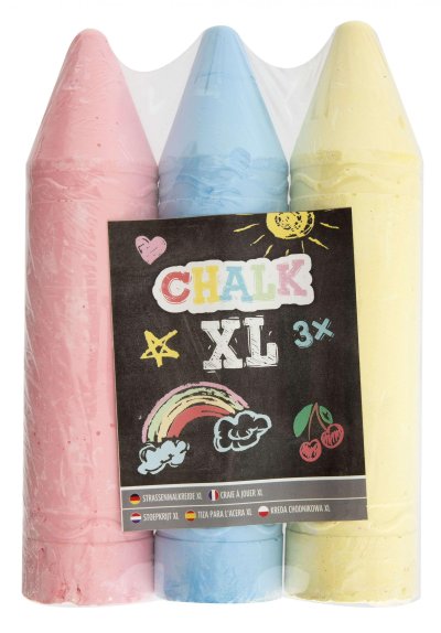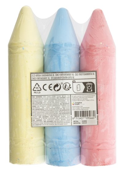 Kriedy XL 3 ks v balení. Veľkosť kriedy 19 cm. Dva druhy - tri farby žltá, modrá a ružová alebo oranžová, zelená a fialová.