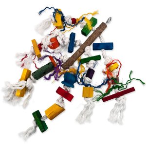 Závesná drevená hračka s povrazmi.