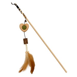 Vábnička s drevenou rukoväťou láka k hre závesom, na ktorom je pripevnená rolnička, drevené srdiečko s catnipovou guličkou, korok a pierka.