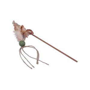 Vábnička s rukoväťou z odolného dreva sapeli má záves s pierkami, guličkou z lisovanej šanty mačacej (catnipu) a šnúrkovými …