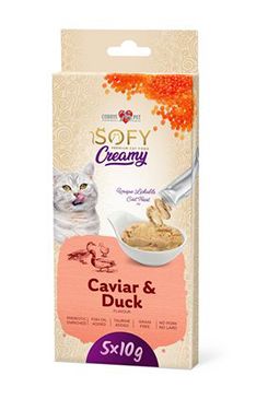 COBBYS PET SOFY Creamy Caviar&Duck 5x10g Doplnkové krmivo pre mačky, mäsová krémová pochúťka s kaviárom a kačacím mäsom, ideálna na natretie na lízaciu podložku alebo priamo do úst alebo do misky. Zloženie: kačacie mäso, kuracie mäso, ryby, kaviár, tapiokový škrob, xantánová guma, taurín, rybí olej, multivitamíny. Kŕmny návod: Môžete natrieť na lízaciu podložku, ale môžu sa podávať aj tradičným spôsobom: priamo do úst alebo do misky.