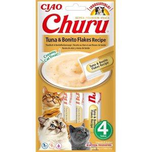 Chúru mäsové pyré pre mačky s tuniakom as kúskami tuniaka.