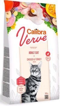 Calibra Cat Verve Adult Chicken & Turkey je kompletné krmivo s vysokým obsahom čerstvého mäsa bez obilnín - s kuraťom a morkou. Receptúra je určená pre dospelé mačky.