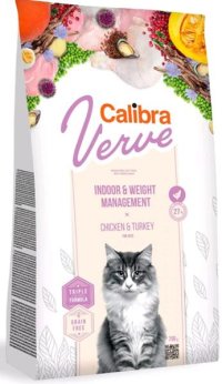 Calibra Cat Verve Indoor + Weight Management Chicken & Turkey je kompletné krmivo bez obilnín s vysokým obsahom čerstvého mäsa - s kuraťom a morkou.