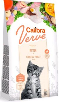 Calibra Cat Verve Kitten Chicken & Turkey je kompletné krmivo bez obilnín s vysokým obsahom čerstvého mäsa - s kuraťom a morkou.