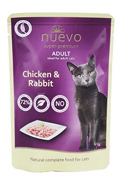 Mačacie vrecko Nuevo Adult kura a králik je kompletné krmivo pre dospelé mačky všetkých plemien s kuracím a králičím mäsom.