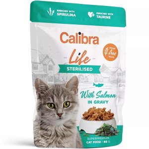 Receptúra s lososom – mäsové kapsičky pre dospelé kastrované a sterilizované mačky obsahuje vysoké množstvo mäsa 76% vo filetoch v omáčke.