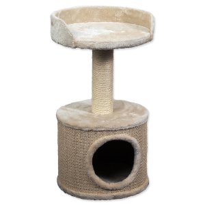 Odpočívadlo v tvare valca s plyšovým poťahom, odpočinkovým miestom s vankúšikom vo vnútri a škrabadlom v hornej časti.