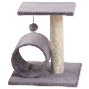 Odpočívadlo s plyšovým poťahom, škrabadlom, plochami na odpočinok a hračkou.