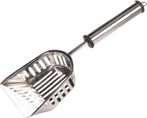 Praktická kovová lopatka na čistenie mačacej toalety.