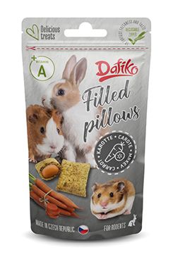 Chutná maškrta vo forme chrumkavých vankúšikov plnených mrkvou, vhodná ako odmena alebo spestrenie bežnej dennej kŕmnej dávky hlodavcov.