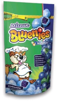 Doplnkové krmivo pre hlodavce vo forme guličiek s ovocím a pravými čučoriedkami.