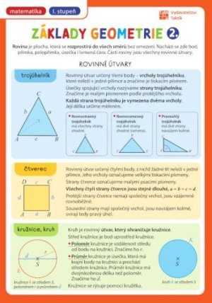 Prehľadová tabuľka: Základy geometrie 2. diel pre 1. stupeň základnej školy, v jednej tabuľke, ktorá sa zmestí do každého zošita či notýska.
