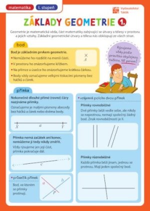Prehľadová tabuľka: Základy geometrie 1. diel pre 1. stupeň základnej školy, v jednej tabuľke, ktorá sa zmestí do každého zošita či notýska.