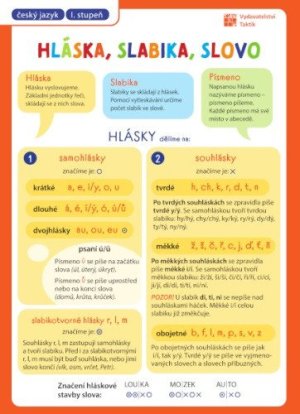 Prehľadová tabuľka: Hláska, slabika, slovo pre 1. stupeň základnej školy, v jednej tabuľke, ktorá sa zmestí do každého zošita alebo notýska.
