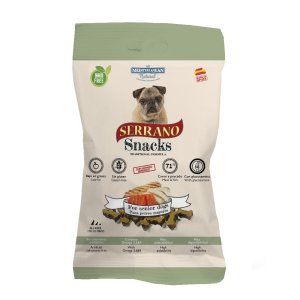 Lahodná maškrta pre psích seniorov v tvare malých kociek so serrano šunkou, morčacím mäsom a ryžou.