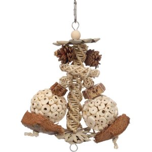 Ručne vyrábaná závesná hračka z prírodných materiálov je ideálna pre malé papagáje.