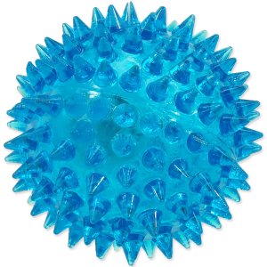 Latexová loptička s bodlinkami od Karlie. Hračka je doplnená o pískatko, ktoré pri stlačení vydáva zvuk.