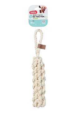 Povrazová hračka pre psov vhodná na hádzanie, žuvanie a preťahovanie. Vyrobená z bavlneného povrazu a prepletená kravskou kožou. Vďaka dvojitej štruktúre sú veľmi pevná, teda odolná pri žuvaní. Prirodzená vôňa kože psa priťahuje a stimuluje jeho prirodzené inštinkty. Štítok s logom z eko kože Žuvaním sa znižuje množstvo zubného plaku. Pri hraní sa posilňuje puto so zvieraťom. Štyri modely: lopta, uzol, preťahovadlo a rukoväť. Štyri veľkosti: 25 cm, 9.