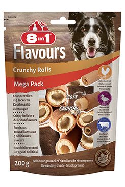 Doplnkové krmivo pre dospelých psov, pochúťky 8in1 Flavours Crunchy Rolls majú vysoký obsah kuracích a kačacích pŕs a tiež hovädzieho mäsa. Navonok chrumkavé s lahodným mäsom vo vnútri Vysoký obsah bielkovín a nízky obsah tuku 80%, ryžová múka, glycerol, tapiokový škrob, sorbitol, kvasnice, schlorid sodný. Kačacie: kačacie prsia 79%, ryžová múka, glycerol, tapiokový škrob, sorbitol, kvasnice, schlorid sodný. Hovädzie: hovädzie mäso 71%, ryžová múka, kačacie prsia 8%, glycerol, tapiokový škrob, sorbitol, schlorid sodný. Analytické zložky: bielkoviny 37%, obsah tuku 5,2%, hrubá vláknina 1,4%, hrubý popol 4%, obsah vlhkosti 18,2%. Doplnkové látky: farbivá. DávkovanieVyberte maškrtu niečo o väčšiu, než je veľkosť papule psa. Pri podávaní pochúťok ako odmeny je potrebné mať na pamäti rovnováhu medzi príjmom potravy a výdajom energie.