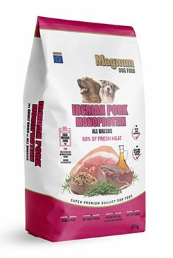 Krmivo Magnum Iberian Pork for All Breeds je vyrobené bez mäsových múčok iba z čerstvého Pyrenejského bravčového mäsa, bez lepku a bez pridaných tukov.