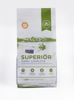 Granule pre šteniatka z lososa, zemiakov a hrachu s 30% obsahom bielkovín na ich podporu rastu a vývoja.