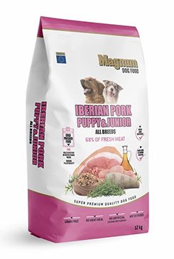 Krmivo Magnum Iberian Pork Puppy & Junior je vyrobeno bez masových mouček pouze z čerstvého Iberského vepřového masa, Atlantické ryby a drubežího masa z volného chovu, bez lepku a bez přidaných tuků.