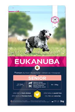 Nová EUKANUBA vylepšená receptúra so zameraním na konkrétnu fázu života - pre psích seniorov stredne veľkých plemien nad 10 rokov - poskytuje na mieru upravenú výživu pre zdravé starnutie a podporu optimálneho telesného stavu vášho psieho seniora.