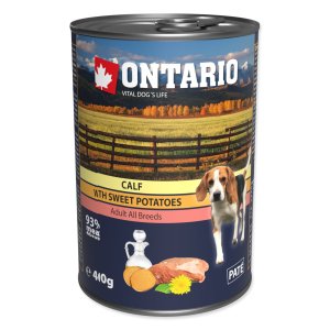 Konzerva s obsahom teľacieho mäsa, sladkých zemiakov, púpavového a ľanového oleja.