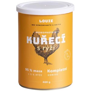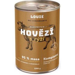 Mäsová konzerva pre psov Louie s obsahom 95% jemne namletého mäsa as 5% ryže bez pridanej želatíny, konzervantov, dochucovadiel, farbív či stabilizátorov.