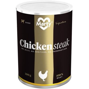 MARTY DeLuxe konzerva - kurací steak: Jednozložková kŕmna surovina pre psov vo forme kusov kuracieho mäsa (steaky) ponúka psovi možnosť stravy z čistého …
