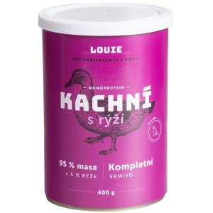 Mäsová konzerva pre psov Louie s obsahom 95% jemne namletého mäsa as 5% ryže bez pridanej želatíny, konzervantov, dochucovadiel, farbív či stabilizátorov.