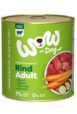 WOW Hovädzie s karotkou je kompletné mokré krmivo pre dospelé psy všetkých plemien so 71% obsahom mäsa a vnútorností od popredného rakúskeho výrobcu.