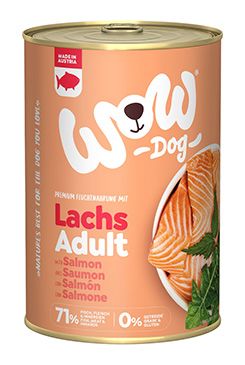 WOW Losos s paradajkami je kompletné mokré krmivo pre dospelé psy všetkých plemien so 71% obsahom mäsa a vnútorností od popredného rakúskeho výrobcu.
