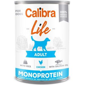 Calibra Dog Life Adult Chicken with Rice - receptúra konzervy s kuracím mäsom, kuracími srdiečkami a ryžou je kompletným krmivom, ktorá je určená pre dospelých psov.