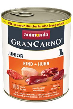 Animonda GranCarno Junioroptimálne vyvážené a chutné krmivo pre šteňatá a dorastajúce psyvyrobené z čerstvého mäsa a vnútorností - s viditeľnými mäsovými kúskyjemná chuť morčacieho mäsa - nefalšovaný pôžitokbez obilnín, bez lepku, bez sóje, bez cukrubez umelých farbív a konzerv (srdce, pečeň, pľúca, mäso), 28,5% morčacie vývar, 15% morčacie mäso (krk, žalúdok), minerálne látky, lososový olej, požltový olej.Analytické zložky: proteín 11%, obsah tuku 5%, vláknina 0,3%, popol 2, 200 IU vitamín D3, 0,5 mg síran meďnatý pentahydrát, 1,4 mg síran mangánatý, monohydrát, 25 mg síran zinočnatý, monohydrátHmotnosť: 800 g
