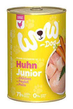 WOW Kuracie s karotkou je kompletné mokré krmivo od popredného rakúskeho výrobcu vhodné pre šteňatá a rastúce psy všetkých plemien vo veku od 2 do 12 mesiacov so 71% obsahom mäsa a vnútorností.