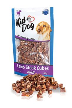KIDDOG doplnkové krmivo, mäsová pochúťka pre psov, mini kocky z jahňacieho mäska.