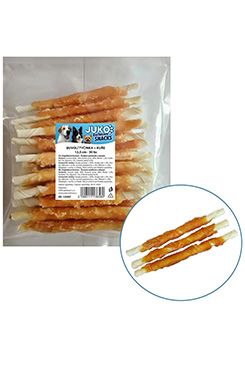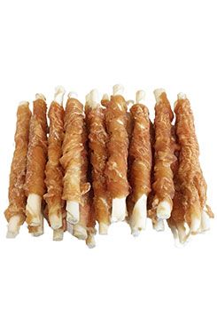 Mäsová pochúťka pre psov, tyčinka z byvolej kože s kuracím mäsom. Zloženie: 60,8% kura, 22% koža, 4% škrob, 6% glycerín, 5% rast. proteín, 2% sorbit, 0,2% soľAnalytické zložky: 55% hrubý proteín, 4% hrubý tuk, 6% hrubý popol, 1% hrubá vláknina, 18% vlhkosť Zaistite zvieraťu pitnú vodu.